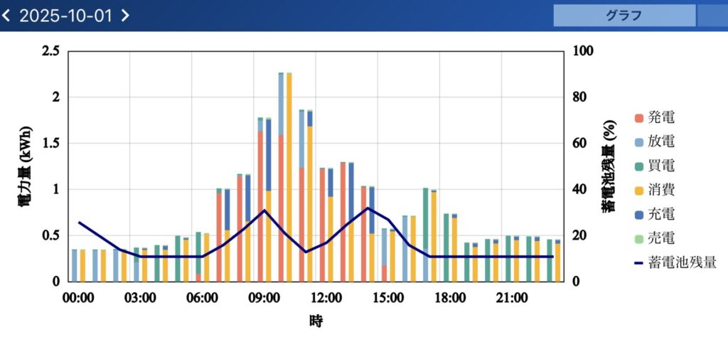 発電を多い時間帯には、蓄電池への充電もできていました。(下記グラフより)