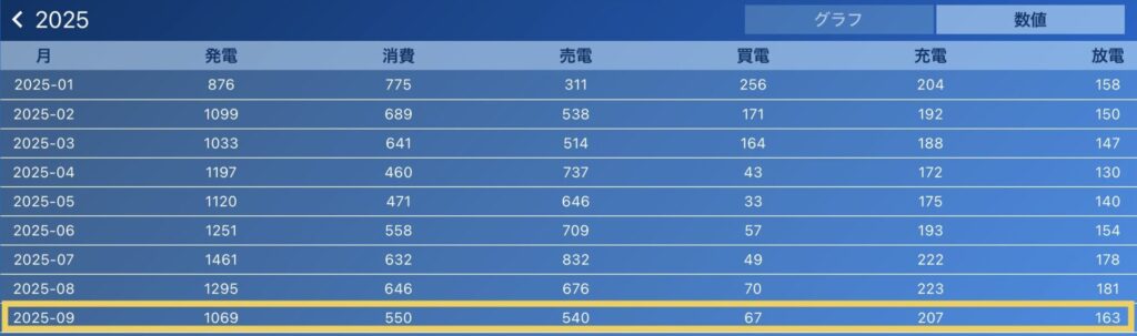 9月だと207kWhが蓄電池の充電にあてられていました。